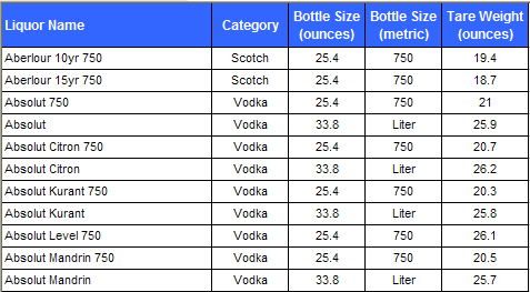 This is a list of 944 liquors which includes the liquor name, liquor category, bottle size in ounces and metric and it's tare weight (the empty bottle weight.) A must have for savvy bar owners and managers that are performing inventories by weighing their 750 ml. and liter bottles.