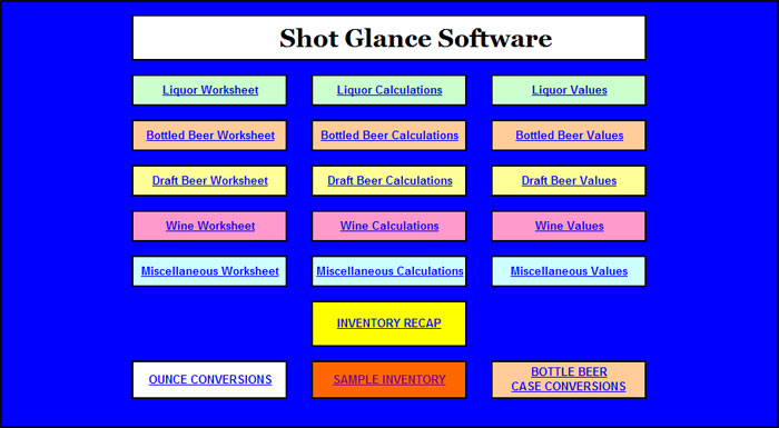 For only an additional $20, if you purchase the Shot Glance gauges, we'll email you a software program that contains a series of 5 easy-to-use Excel spreadsheets for inventorying Liquor, Wine, Bottled Beer, Draft Beer and Miscellaneous Items. Managers simply enter inventory data into the spreadsheets and the software automatically calculates inventory values, potential revenues and beverage cost percentages. These calculations help managers verify that depleted inventories have been rung up properly as sales. Just choose the 'Shot Glance Gauges & Software' option when placing your order.